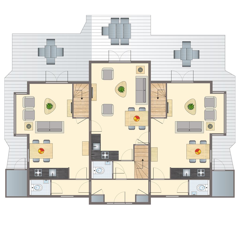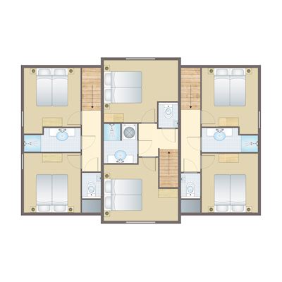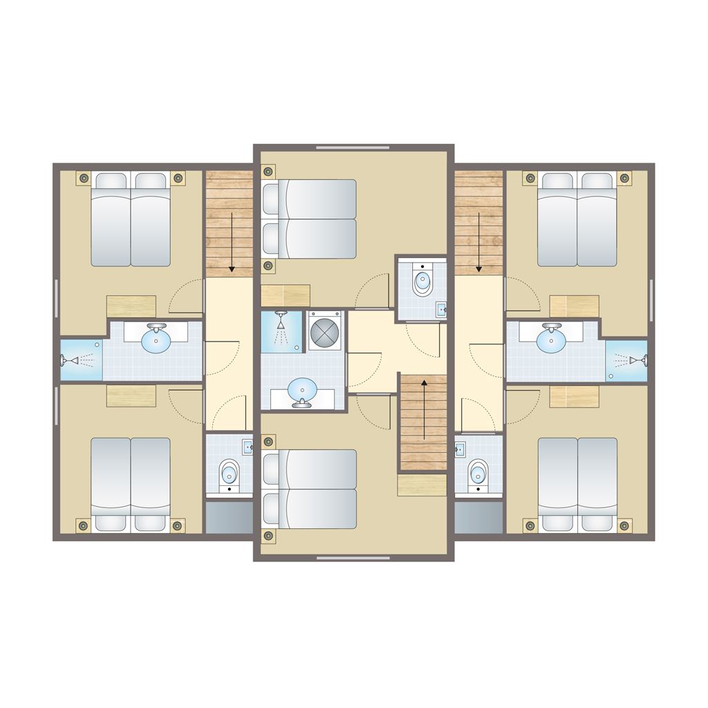 - Sechs Schlafzimmer mit jeweils zwei Boxspring-Einzelbetten auf der ersten Etage