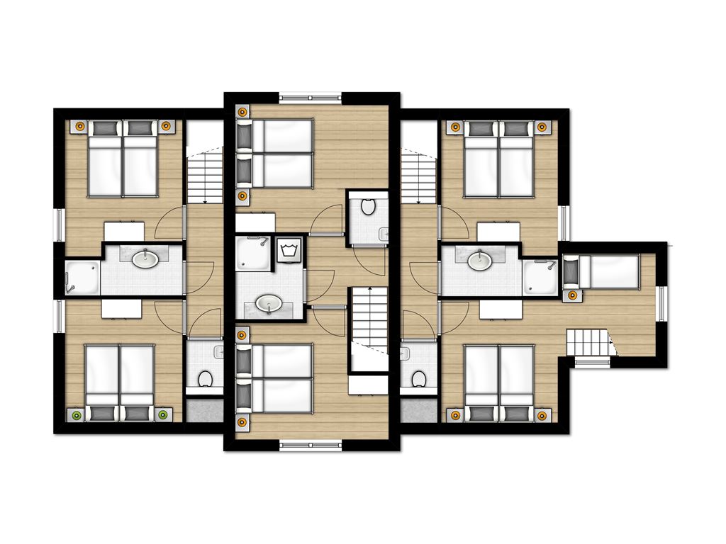 - Fünf Schlafzimmer mit jeweils zwei Boxspring-Einzelbetten auf der ersten Etage